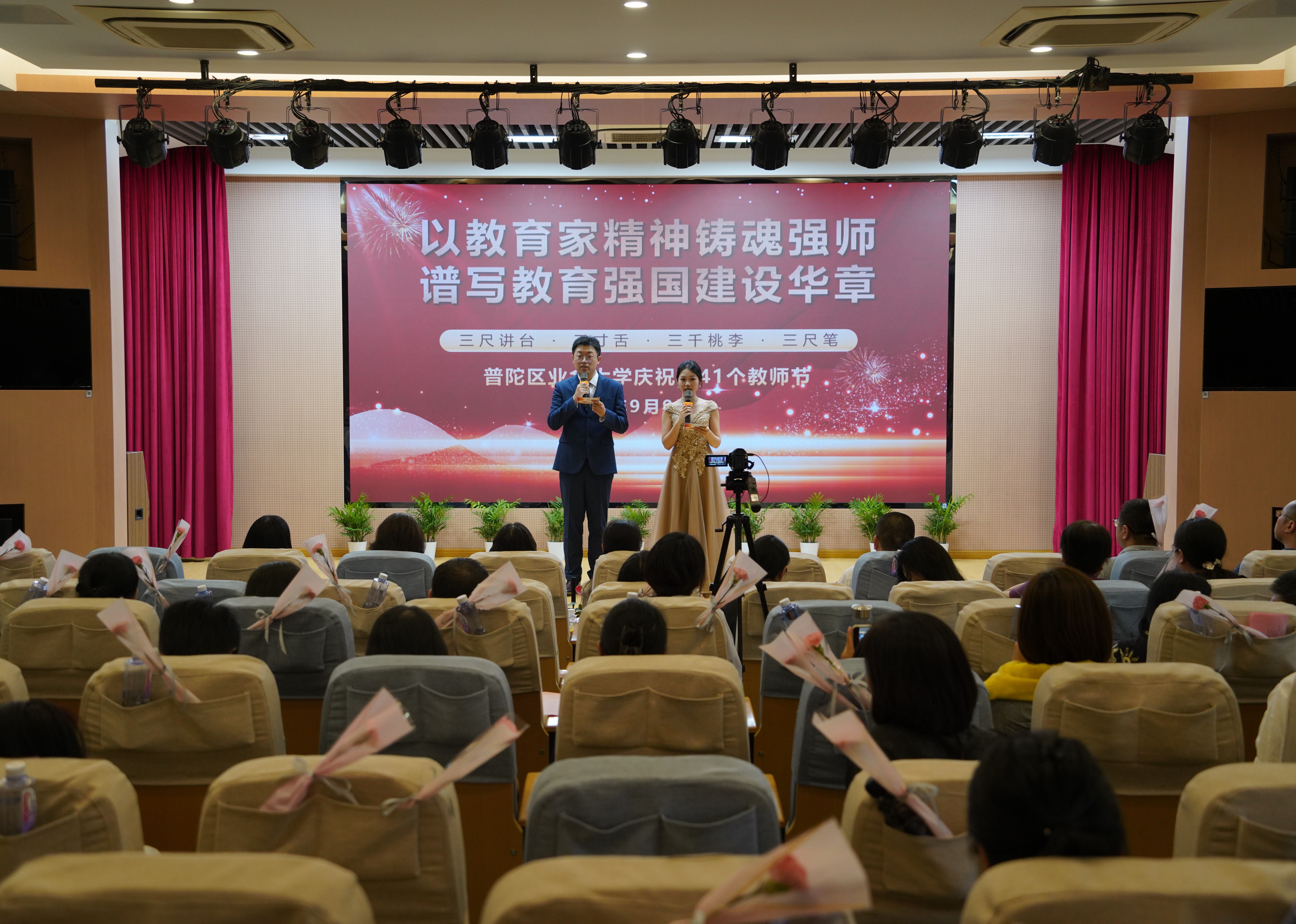 金秋送爽,师恩难忘。2025年9月9日下午,普陀区业余大学在晓剧场隆重举行第41个教师节主题活动。普陀区教育局副局长王贞飞、职成科科长冯琳,校党总支部书记张喆、校长徐文清等领导班子成员与全校教职员工欢聚一堂,以表彰、访谈、文艺展演、师徒结对等丰富形式,向躬耕终身教育一线的老师们致以节日最崇高的敬意。
