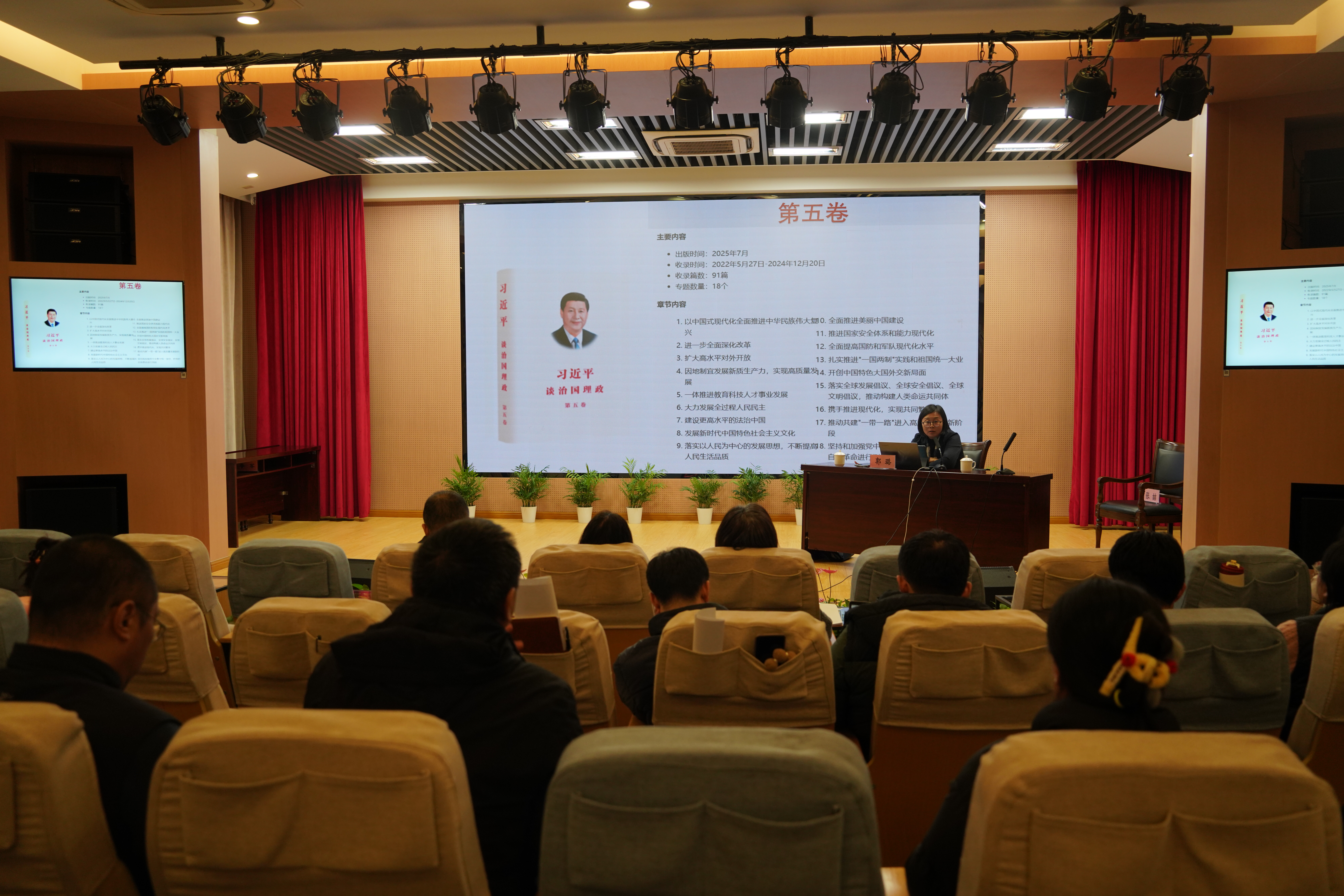 会上,上海市普陀区区委党校专家郭璐以“深入学习贯彻《习近平谈治国理政》第五卷 奋力谱写中国式现代化新篇章”为题讲授专题党课。她首先系统梳理《习近平谈治国理政》第一卷至第五卷的核心要义和思想脉络,随后聚焦第五卷展开重点解读。《习近平谈治国理政》第五卷始终围绕一个核心主线—破解中国发展不同阶段的突出矛盾;始终坚守一个根本立场—以人民为中心;始终遵循一个实践逻辑—问题导向、系统观念、守正创新。第五卷既是对前四卷思想的集成总结,更是对新发展阶段需求的理论回应,为“十四五”到“十五五”的战略升维,提供了最直接的思想支撑。它的诞生,标志着习近平新时代中国特色社会主义思想的进一步丰富完善,为我们在新征程上推进中国式现代化提供了强大思想武器。